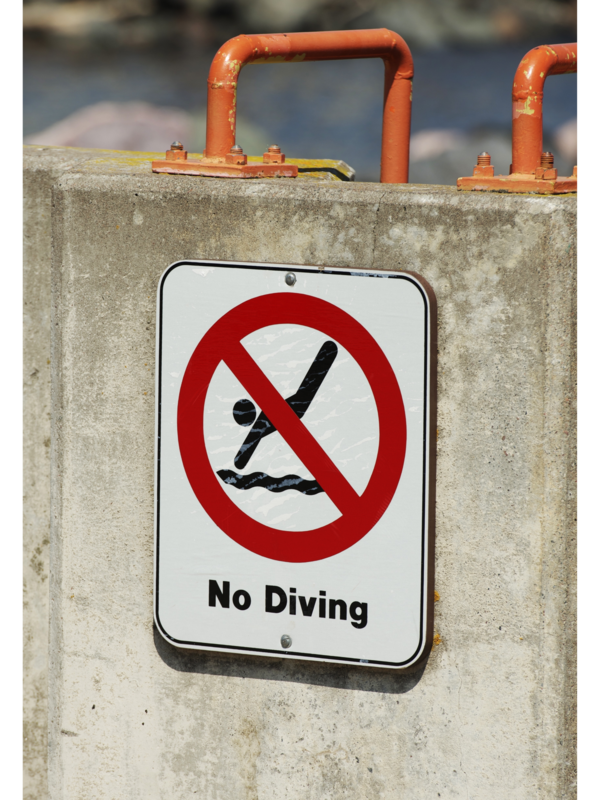 When you enter the water, always go in feet first. Avoid diving. Don’t dive off of cliffs, bridges, or other high surfaces.